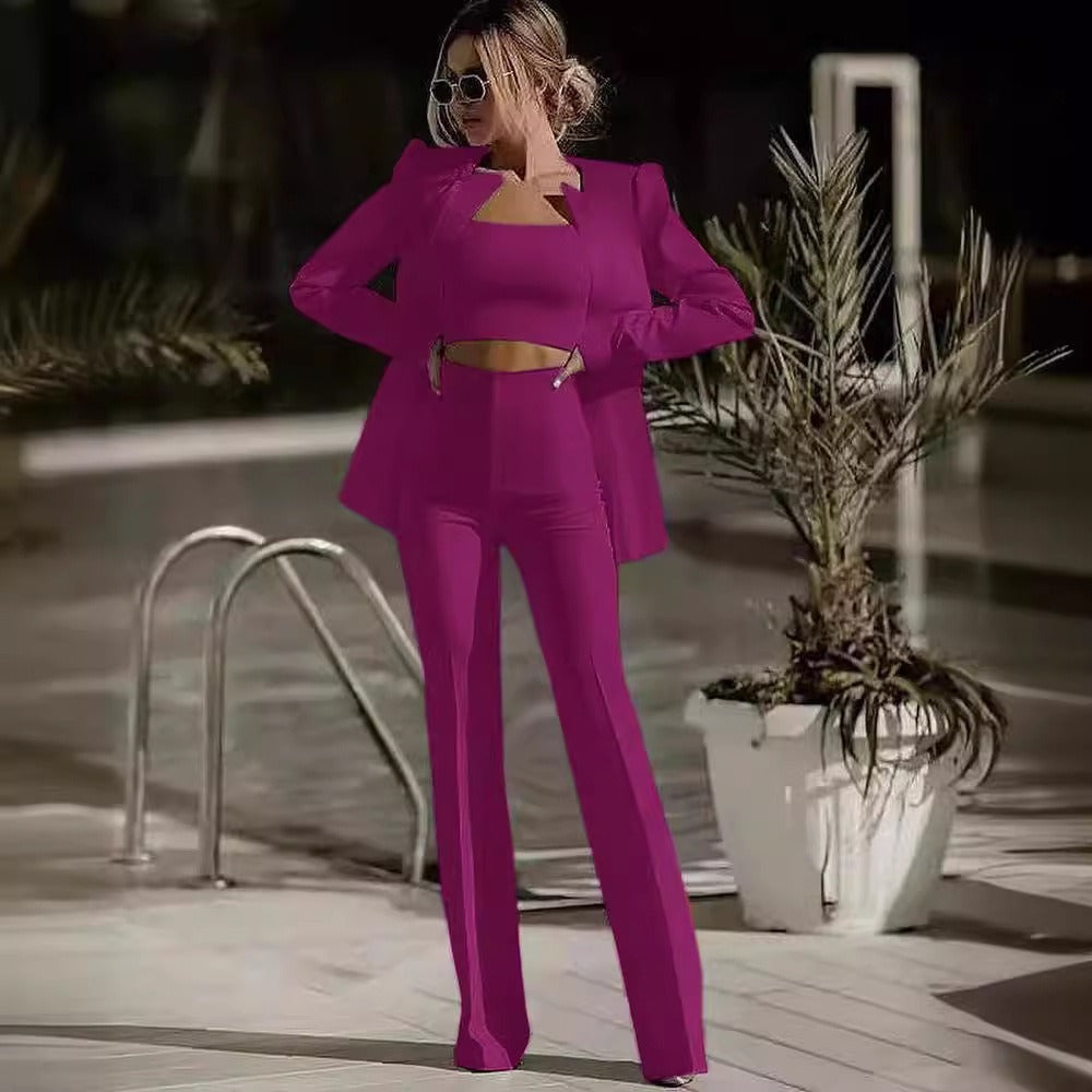 The Modern Solid Color Blazer Set for Women combines timeless elegance with contemporary style. This set, featuring a blazer, high-waisted trousers, and a bralette, is perfect for casual days, office hours, or formal events. Its refined design and sleek silhouette make it an essential addition to any wardrobe, offering effortless sophistication and versatility.