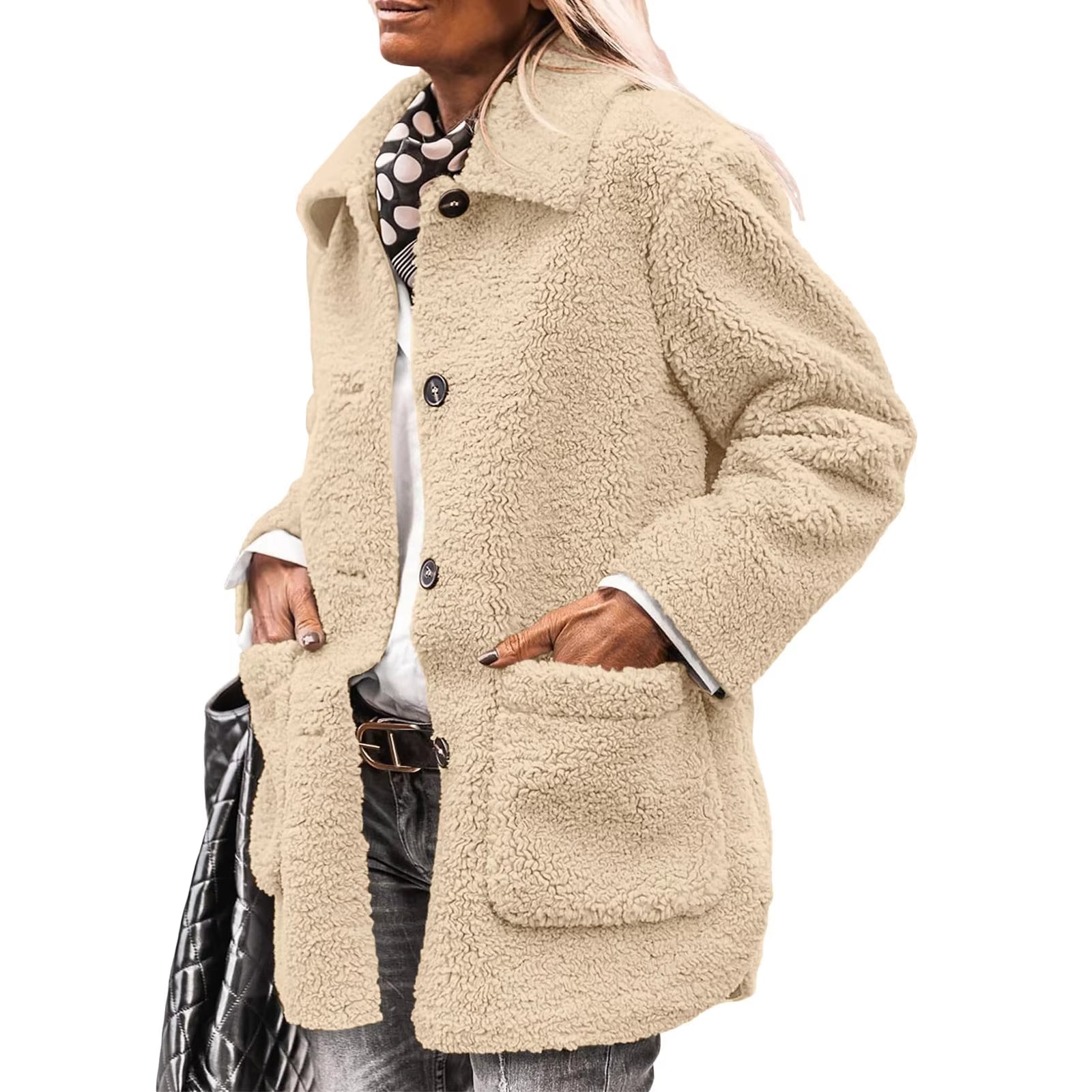Women's button-up cardigan with long sleeves, a collared neckline, and front pockets. Designed with a relaxed fit and plain pattern, this piece is suitable for layering during the winter season. The structured yet casual design makes it appropriate for everyday wear in both casual and semi-formal settings.